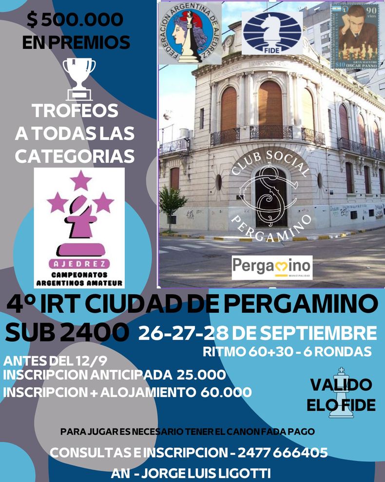Del 26 al 28 de septiembre, Pergamino será nuevamente sede de un torneo de ajedrez de gran jerarquía. En el salón principal del histórico Club Social Pergamino, se disputará la cuarta edición del IRT Ciudad de Pergamino (Sub 2400), un certamen avalado por la Federación Argentina de Ajedrez (FADA) y la Federación Internacional de Ajedrez (FIDE), válido para el ranking internacional ELO y clasificatorio para el Campeonato Argentino Amateur.