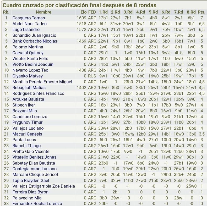 Con una trayectoria en pleno ascenso, el ajedrecista Tomás Casquero se coronó campeón Sub 9 en el Argentino Escolar de ajedrez, disputado entre el viernes y este martes en Vicente López, Buenos Aires. El certamen fue homologado por la Federación Argentina de Ajedrez (FADA) y reunió a 163 competidores de todo el país (33 en la categoría Sub 9) en una competencia de alto nivel.