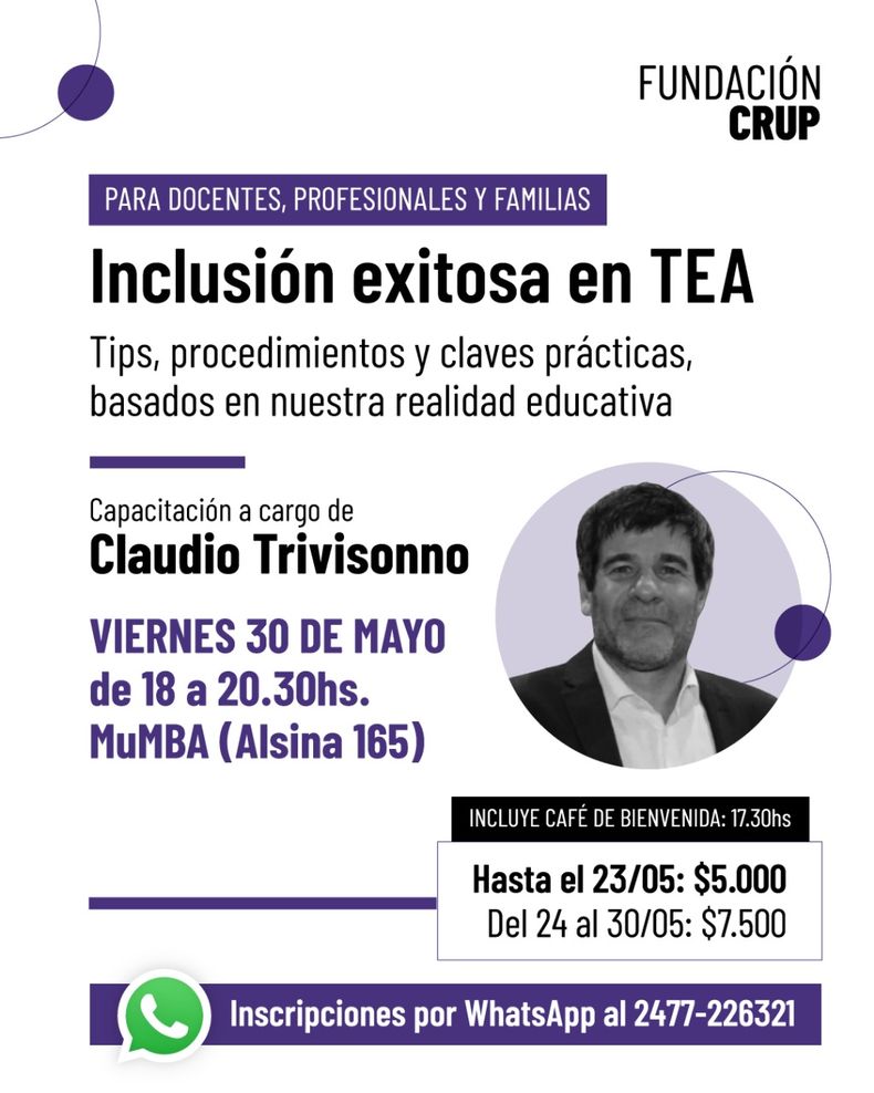 Este viernes a las 18:00, el Museo Municipal de Bellas Artes de Pergamino será sede de una capacitación clave sobre “Inclusión Exitosa en Trastorno del Espectro Autista (TEA)”. La jornada, que se extenderá hasta las 20:30, estará a cargo del especialista Claudio Trivisonno. La actividad tiene un costo de $7.500 y lo recaudado será a total beneficio de la Escuela Nº 502. Para participar, es necesario inscribirse enviando un mensaje al WhatsApp 2477-226321.