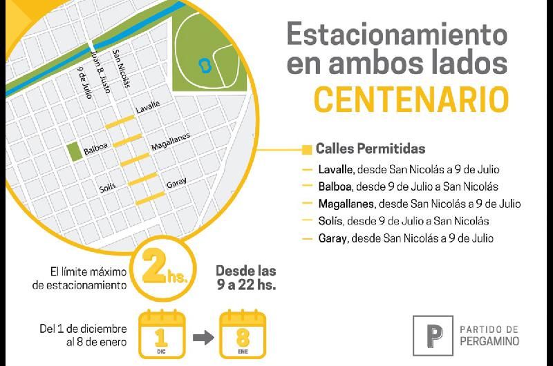 Explicaron que el estacionamiento sobre los lados izquierdo y derecho se permitirá desde este domingo y hasta el 8 de enero de 2020, en Moreno, desde avenida Alsina a Florida; Alberti, desde Dorrego a avenida Alsina; Luzuriaga, desde Pueyrredón a avenida Alsina; San Nicolás, desde avenida Alsina a Avenida de Mayo; Pueyrredón, desde Doctor Alem a avenida Rocha; Pinto, desde Moreno a 9 de Julio; Dorrego, desde 25 de Mayo a San Nicolás; Lavalle, desde San Nicolás a 9 de Julio; en la zona de Balboa, desde 9 de Julio a San Nicolás; Magallanes, desde San Nicolás a 9 de Julio; Solís, desde 9 de Julio a San Nicolás; Garay, desde San Nicolás a 9 de Julio.