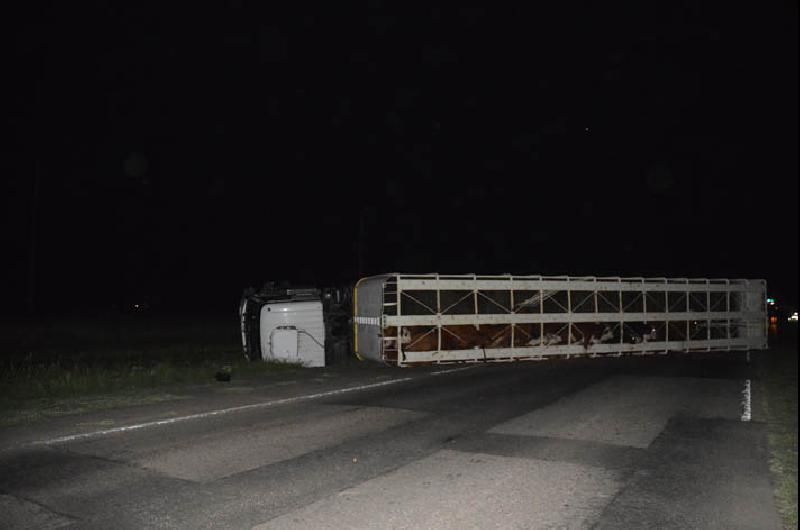 La ruta permaneció cortada durante varias horas ya que debían retirar el camión que había volcado con 55 vaquillonas, muchas de ellas muertas y el resto con golpes importantes.