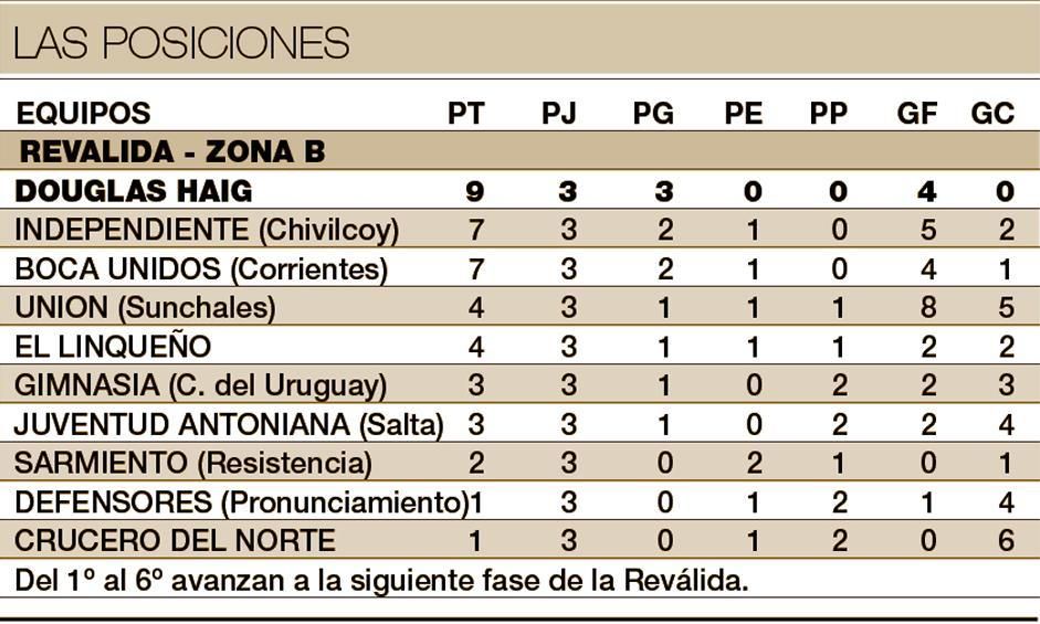 Por la tercera fecha de la Zona B de la Reválida del Torneo Federal A, el domingo Douglas Haig debutó de local en esta instancia luego de dos presentaciones consecutivas como visitante y logró una nueva victoria 1 a 0 frente a Sarmiento de Resistencia. Con esta victoria el "Rojinegro" continúa siendo el único líder y con puntaje perfecto, con dos unidades de ventaja sobre sus principales escoltas, Independiente de Chivilcoy y Boca Unidos de Corrientes.