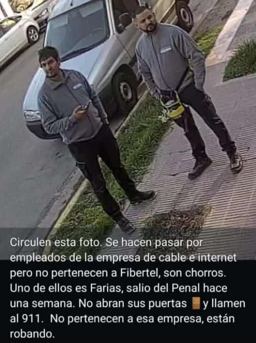 "Circulen esta foto. Se hacen pasar por empleados de la empresa de cable e internet pero no pertenecen a Fibertel, son chorros. Uno de ellos es Farias, salió del Penal hace una semana. No abran sus puertas y llamen al 911. No pertenecen a esa empresa, están robando", rezaba el alerta.