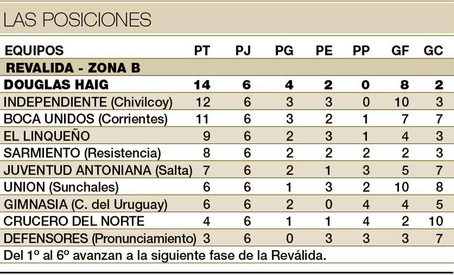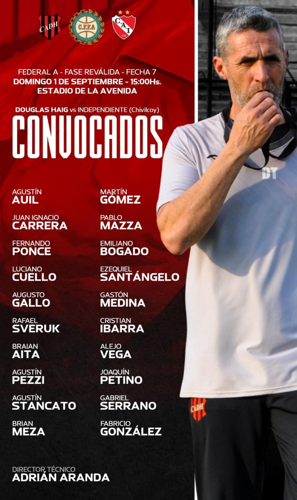 Por la séptima fecha de la Zona B de la Reválida del Torneo Federal A de fútbol, Douglas Haig recibirá este domingo desde las 15:00 a Independiente de Chivilcoy en el estadio "Miguel Morales", con el arbitraje del cordobés Jonathan Correa y María Bevilacqua y Evelyn Luján como asistentes.