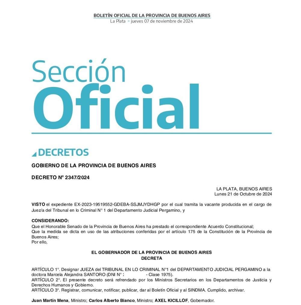 El Decreto Nº 2353/2024 de la misma fecha de rúbrica, pero publicado el viernes 8 de noviembre en el Boletín Oficial expresa: "Visto el expediente EX-2023-19519092-GDEBA-SSJMJYDHGP por el cual tramita la vacante producida en el cargo de Juez/a del Tribunal en lo Criminal N° 1 en el Departamento Judicial Pergamino, y considerando: que el Honorable Senado de la Provincia de Buenos Aires ha prestado el correspondiente Acuerdo Constitucional; que la medida se dicta en uso de las atribuciones conferidas por el artículo 175 de la Constitución de la Provincia de Buenos Aires; Por ello, el gobernador de la provincia de Buenos Aires decreta