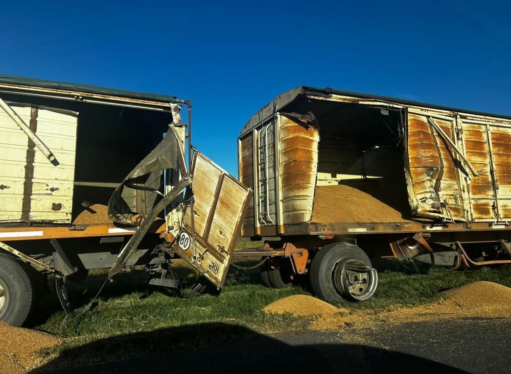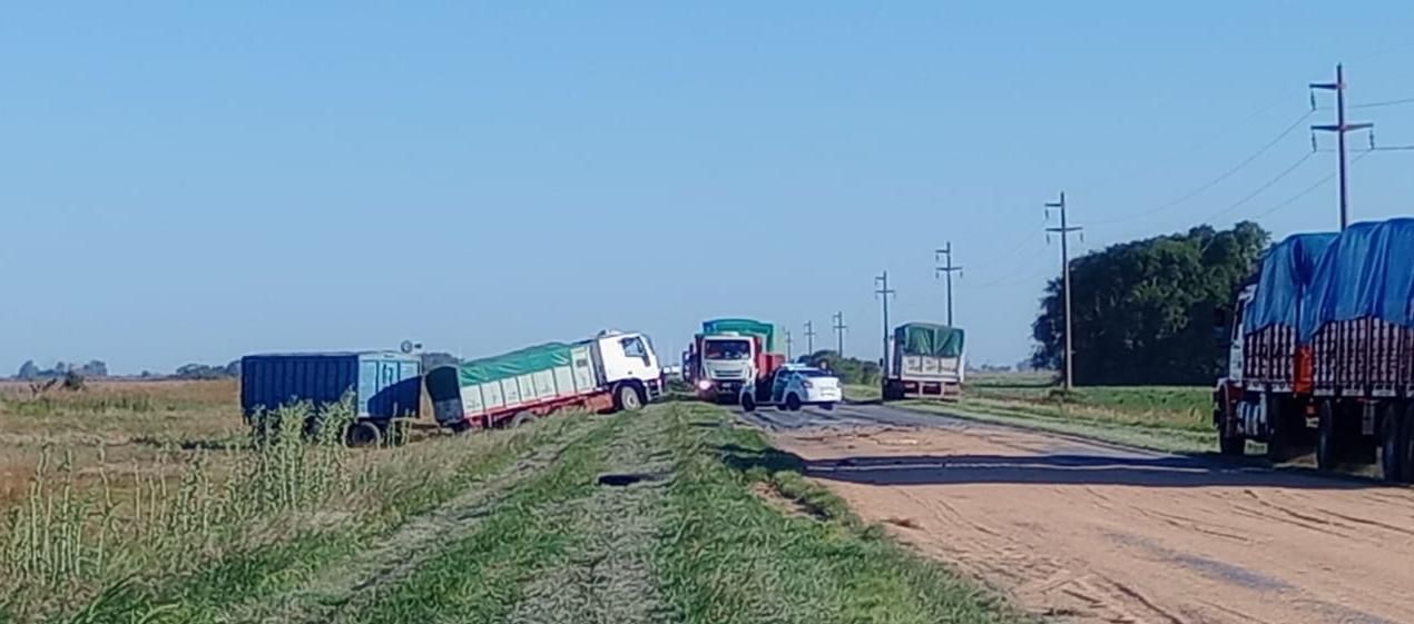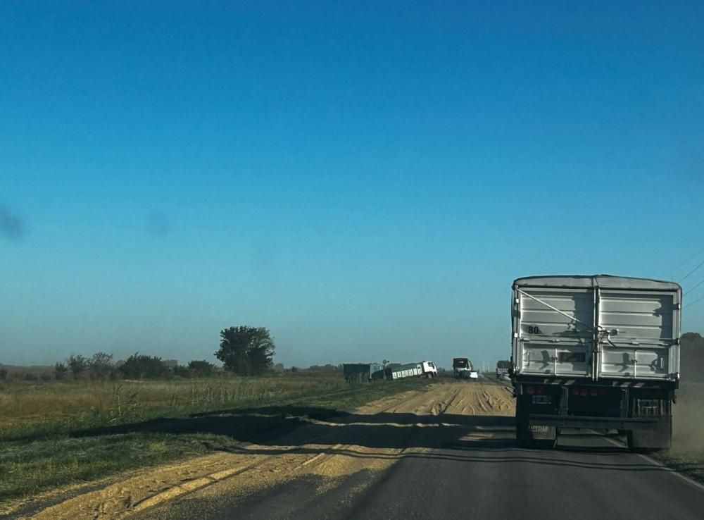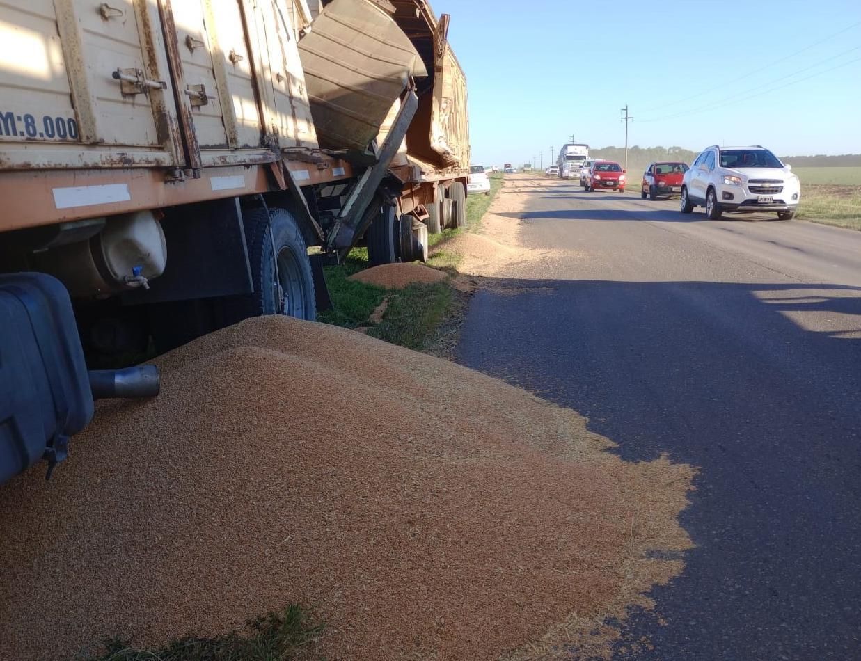 Las averías en el camión y el acoplado generaron que los granos de la carga cayeran y quedaran esparcidos por la cinta asfáltica.