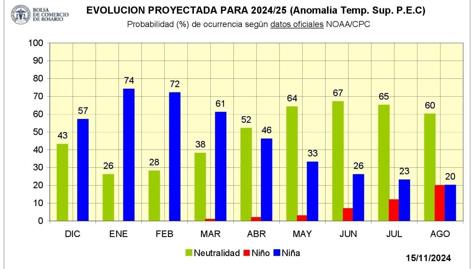 El panorama climático muestra un cambio alentador para la región núcleo según el último reporte de la Bolsa de Comercio de Rosario (BCR). Allí se pronostica que la probabilidad de que el fenómeno de La Niña se presente en diciembre "disminuyó del 71% al 57%", lo que sugiere mejores condiciones para la campaña gruesa en la mayoría de las regiones productoras del país.