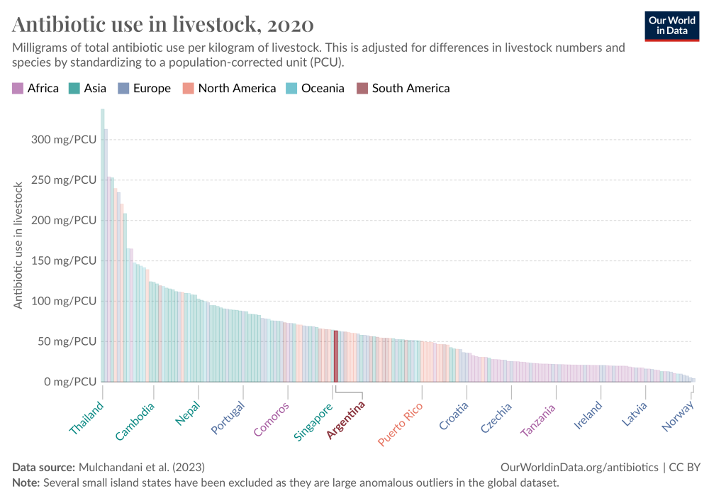 Las diferencias en el uso de antibióticos también son notorias entre países. Tailandia, por ejemplo, utiliza 80 veces más antibióticos en la producción ganadera que Noruega. Las regiones con mayores niveles de uso se concentran en Asia y América, mientras que Europa y África muestran cifras considerablemente más bajas.