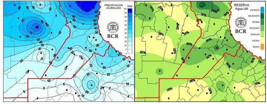 Las precipitaciones también han sido clave en la mejora de la humedad del suelo. En la última semana, el 50% de la región núcleo recibió entre 20 y 100 mm, con los mayores acumulados concentrados en la mitad norte. Como resultado, las áreas en sequía desaparecieron y hoy predominan reservas hídricas entre escasas y regulares, con algunas zonas en condiciones óptimas.