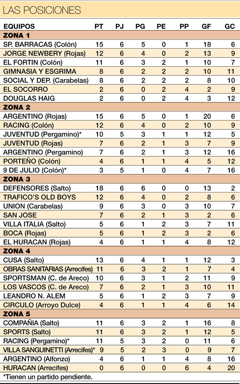 Con la disputa de la séptima está llegando a su fin la primera rueda de la Fase Regular del Torneo 5 Ligas de fútbol. Solo faltan jugarse dos partidos pendientes: uno tendrá como protagonistas este jueves (a las 21:00) a Racing de Pergamino, que recibirá a Villa Sanguinetti en el estadio “Carlos Morales” (sin público) para jugar los minutos que restan de este encuentro de la tercera fecha. El “Bohemio” quedará como único líder de la Zona 5 si empata o gana, mientras que el equipo arrecifeño se subirá a la punta en el caso de un triunfo. Y el otro postergado es 9 de Julio de Colón-Juventud de Pergamino, correspondiente a la séptima fecha de la Zona 2.